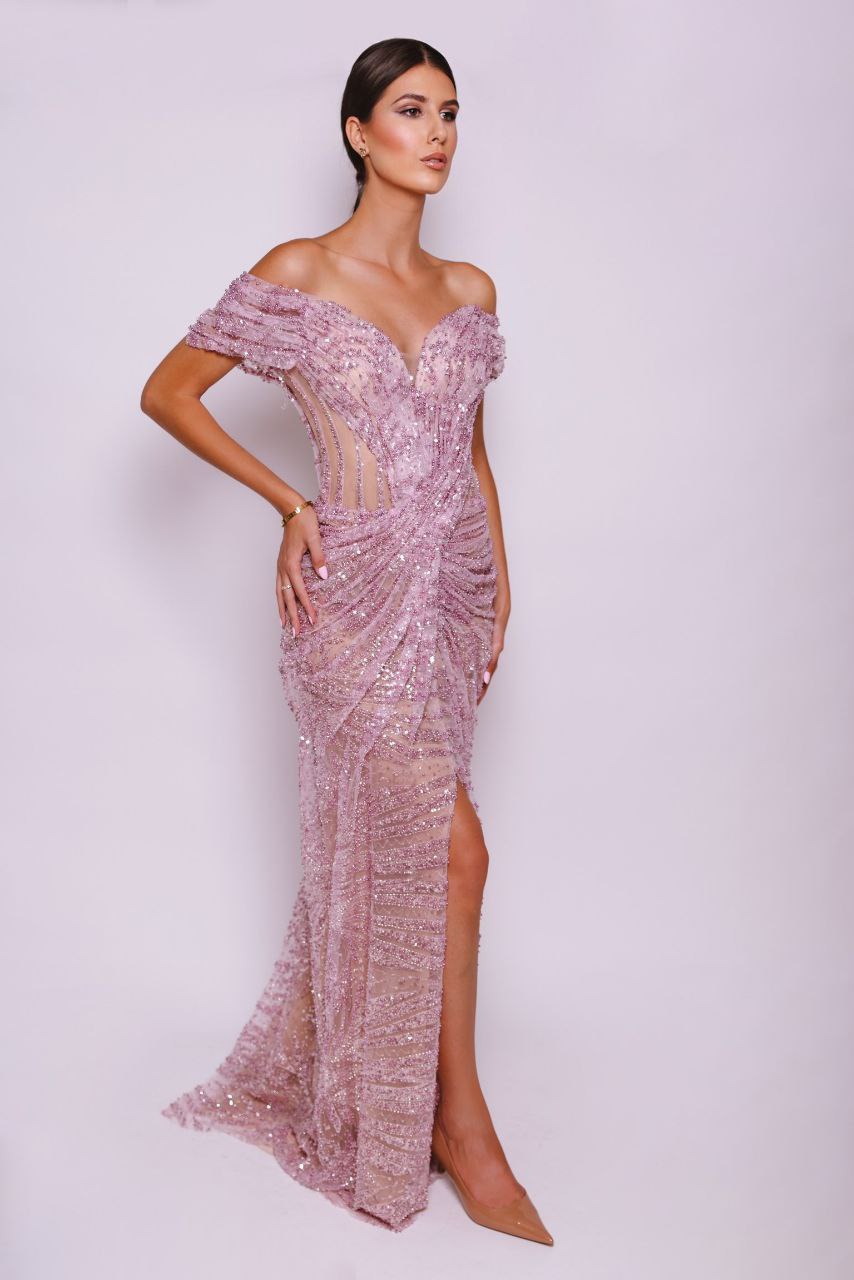 This evening gown is the epitome of romantic sophistication. Crafted with a nude mesh fabric entirely covered in shimmering sequins and beading in a deep mauve/pink-purple shade, the dress features a long bodycon silhouette. It includes appealing off-shoulder detailing and a deep plunging V-neckline. The key features are the ruched styling and strategic cut-outs at the waistline, which emphasize the figure, paired with a high slit on the skirt.