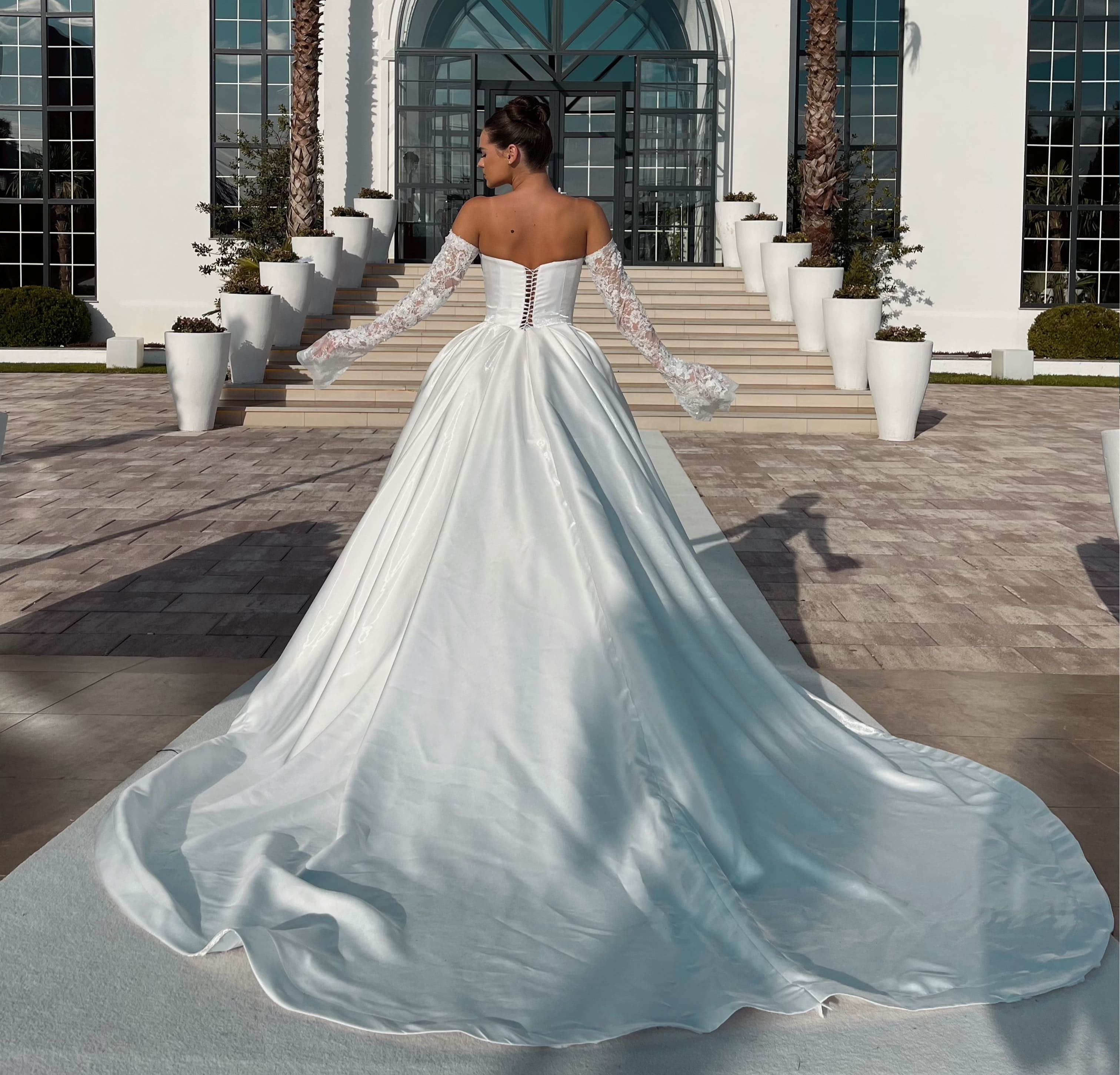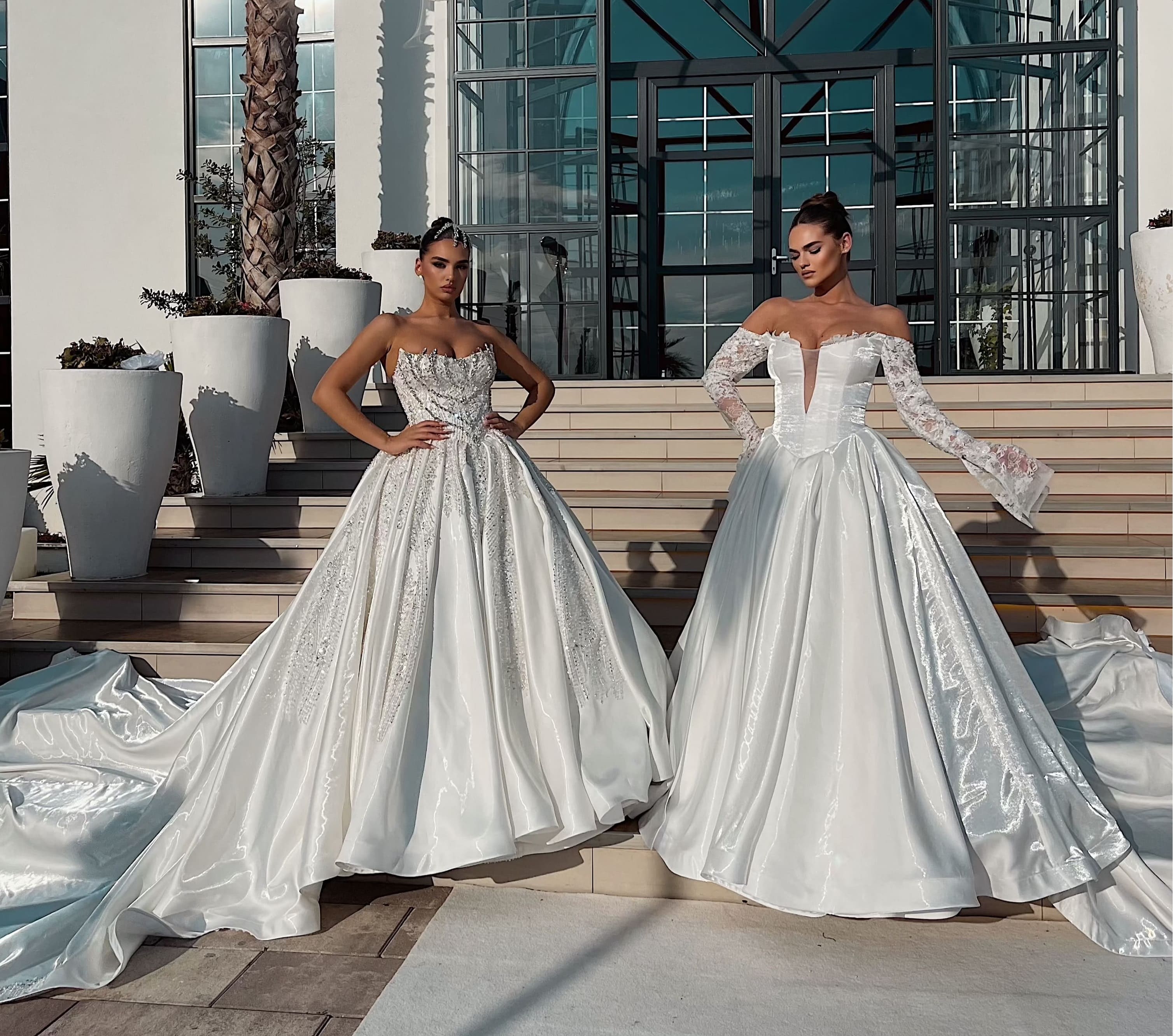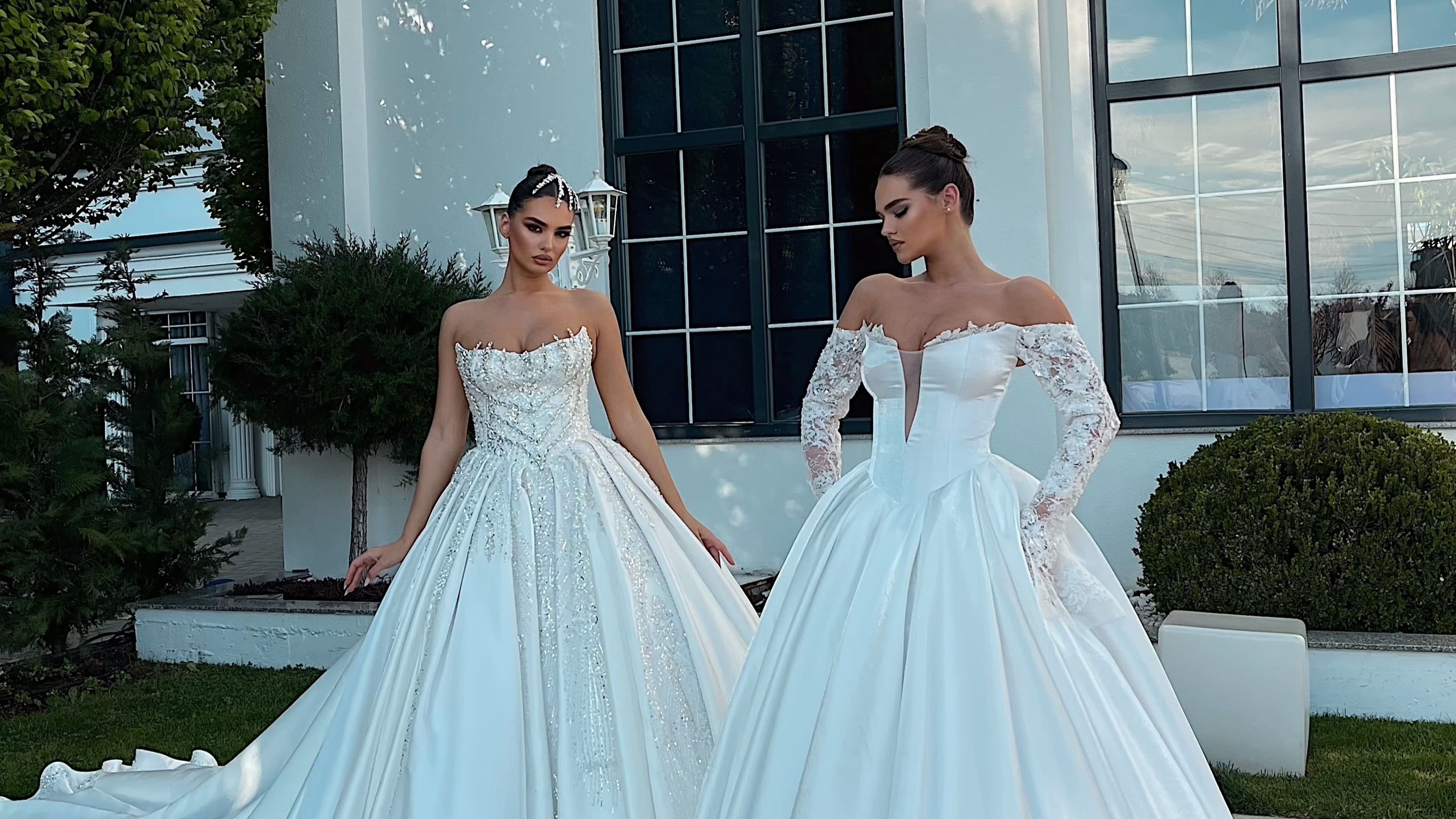 Përjetoni magjinë e ditës tuaj të madhe me dy kryevepra të dizajnuara për t’ju bërë të ndiheni si mbretëreshë. Velloja Majtas mahnit me korsetin e saj të detajuar, të qëndisur me perla dhe dantella, dhe bishtin e gjatë e të fryrë. Velloja Djathtas sjell një elegancë klasike me dekoltenë e hapur dhe mëngët e gjata ‘off-shoulder’ me dantellë. Të dyja fustanet shfaqin volumin madhështor të stilit ball gown, të përkryer për një ceremoni luksoze në natyrë. Cila do të ishte zgjedhja juaj?