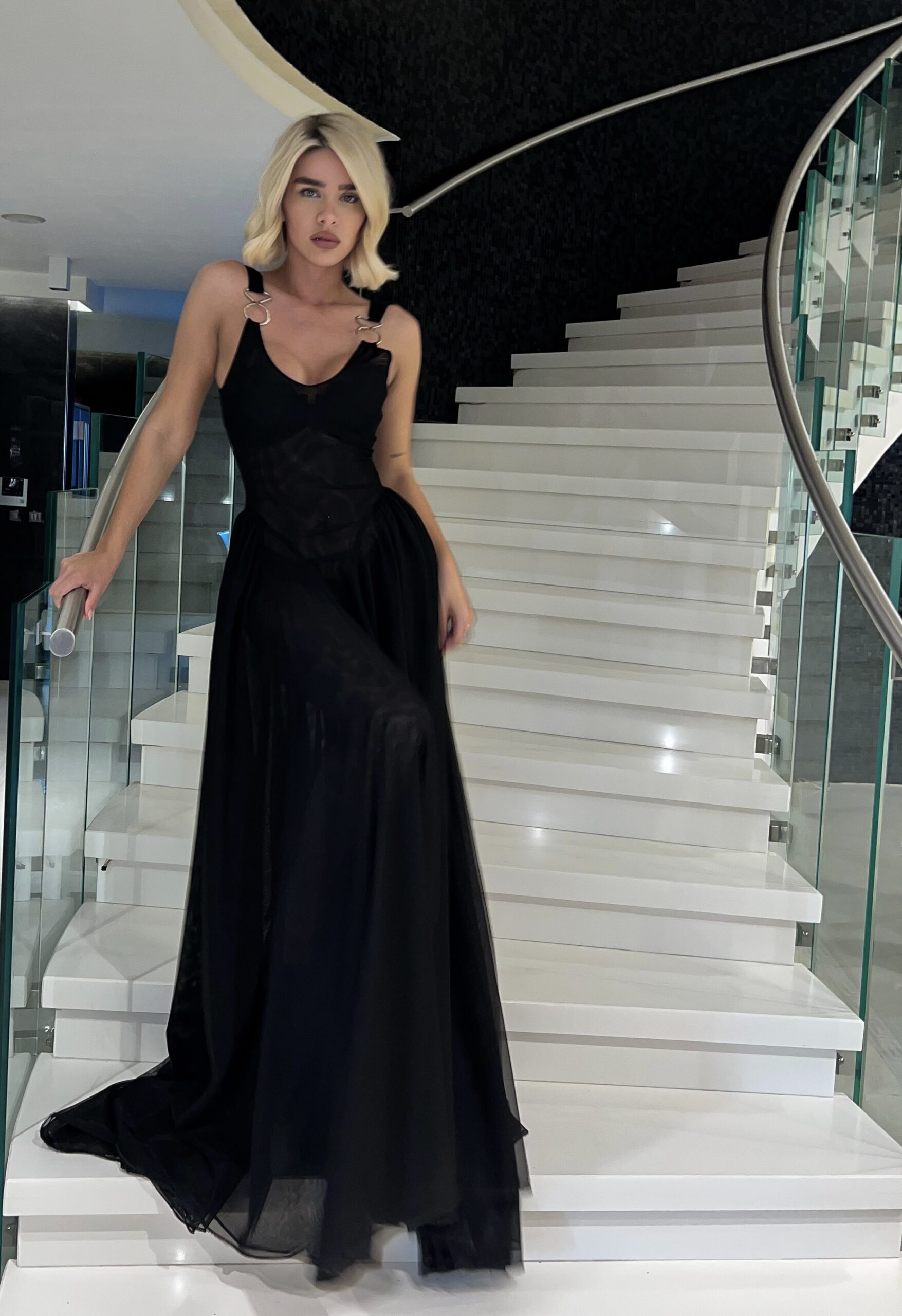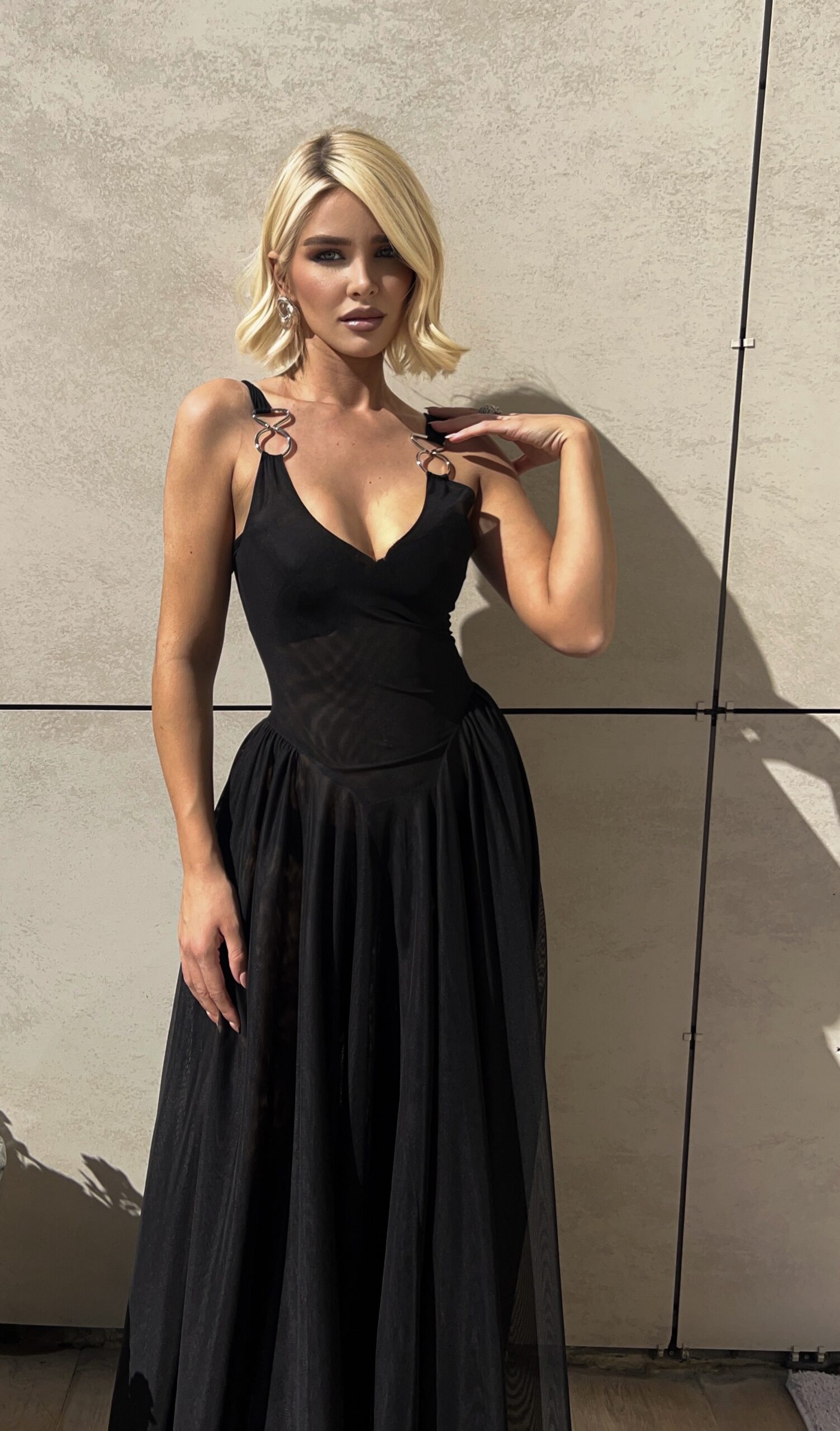 Një fustan i gjatë në ngjyrë të zezë klasike, që mishëron elegancën e pastër dhe stilin modern. Me prerje të rrjedhshme dhe dizajn minimalist, ky fustan thekson siluetën dhe krijon një pamje të sofistikuar e të fuqishme. I përshtatshëm për mbrëmje gala, evente formale dhe raste ku eleganca flet vetë.
