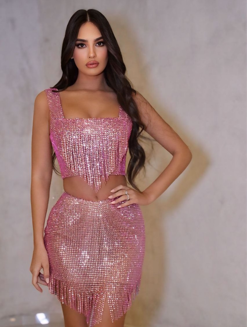 Ky komplet mahnitës me dy pjesë sjell energji maksimale feste me shkëlqimin e tij magjepsës. I punuar tërësisht nga rrjetë me gurë shkëlqyes në një nuancë të ndezur rozë, ky set përfshin një crop top me dekolte katrore dhe një mini fund asort. Të dyja pjesët kanë detaje dramatike me fruda që lëvizin dinamkisht me çdo hap të veshëses. Ky outfit është zgjedhja ideale për festivale, klube apo çdo rast ku dëshiron të jesh në qendër të vëmendjes.