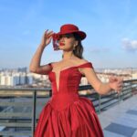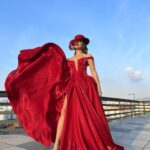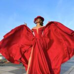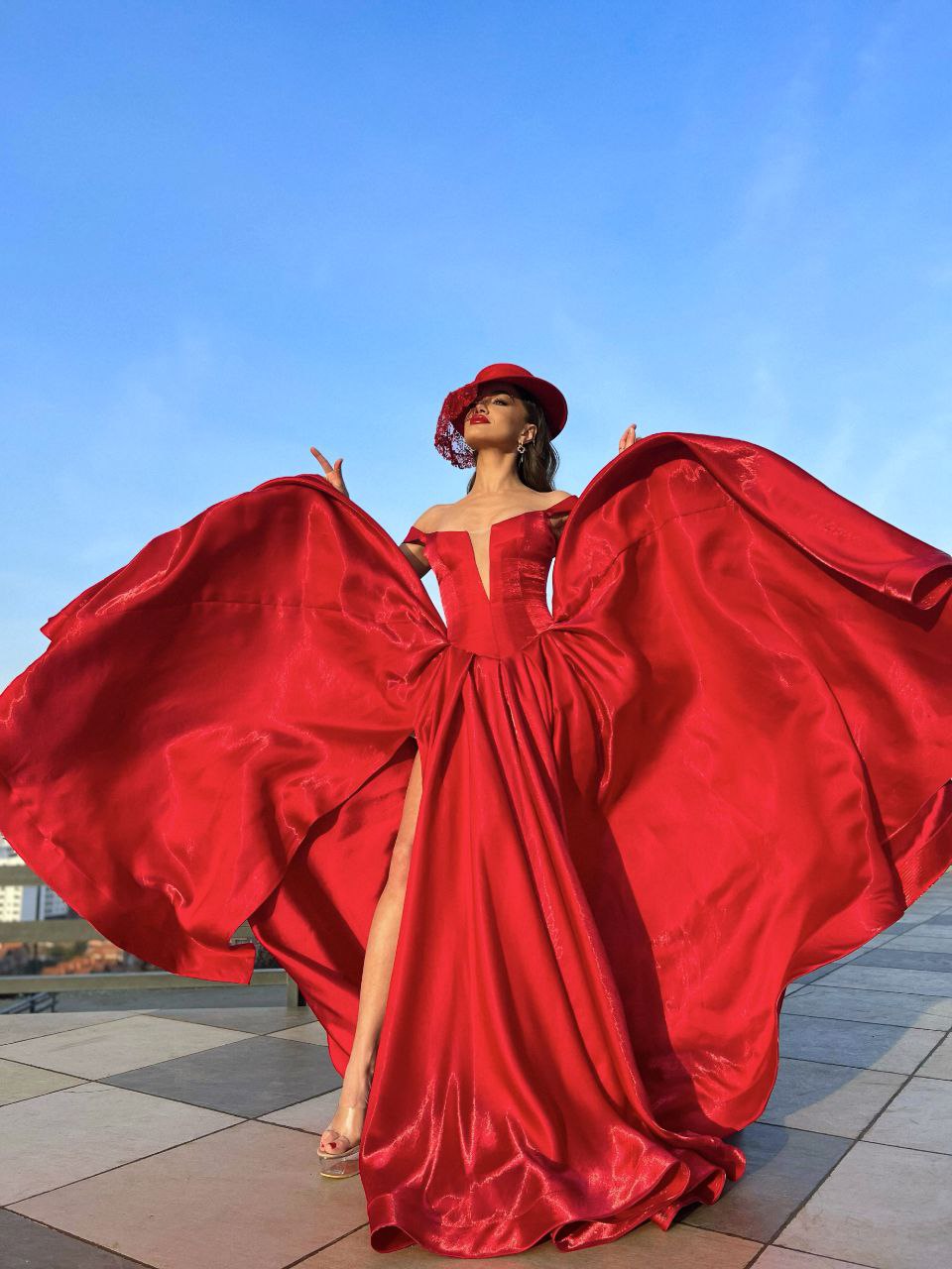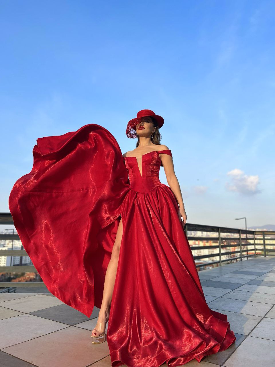 This fiery red evening gown is the epitome of drama and grandeur. Crafted from a high-shine satin or organza material, the dress features an elegant off-the-shoulder neckline and a bold, high slit on the leg. The main feature is the immense, dramatic volume of fabric on both sides of the gown, which gives it a powerful, sculptural shape, especially when caught by the wind. Paired with a red fascinator hat, this gown creates a captivating and unforgettable statement look.