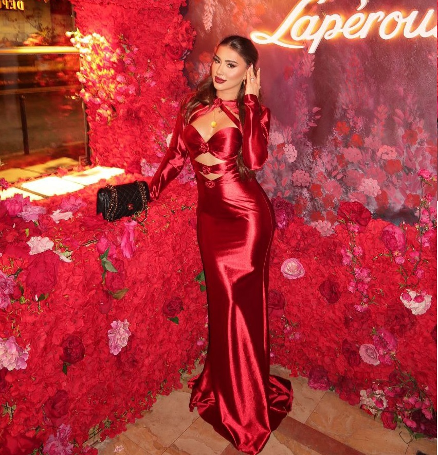 This is a luxurious, full-length evening gown crafted from a fiery red, high-shine satin material. The dress features a bold and elegant design, characterized by striking cut-out details below the bust and at the waistline, which beautifully accentuate the wearer’s figure. The bodice is structured like a bustier, connected by a flattering band at the midriff, and it includes long sleeves. The skirt flows down in a fitted silhouette, creating a dramatic and glamorous look, perfect for a high-profile event or a red carpet appearance.